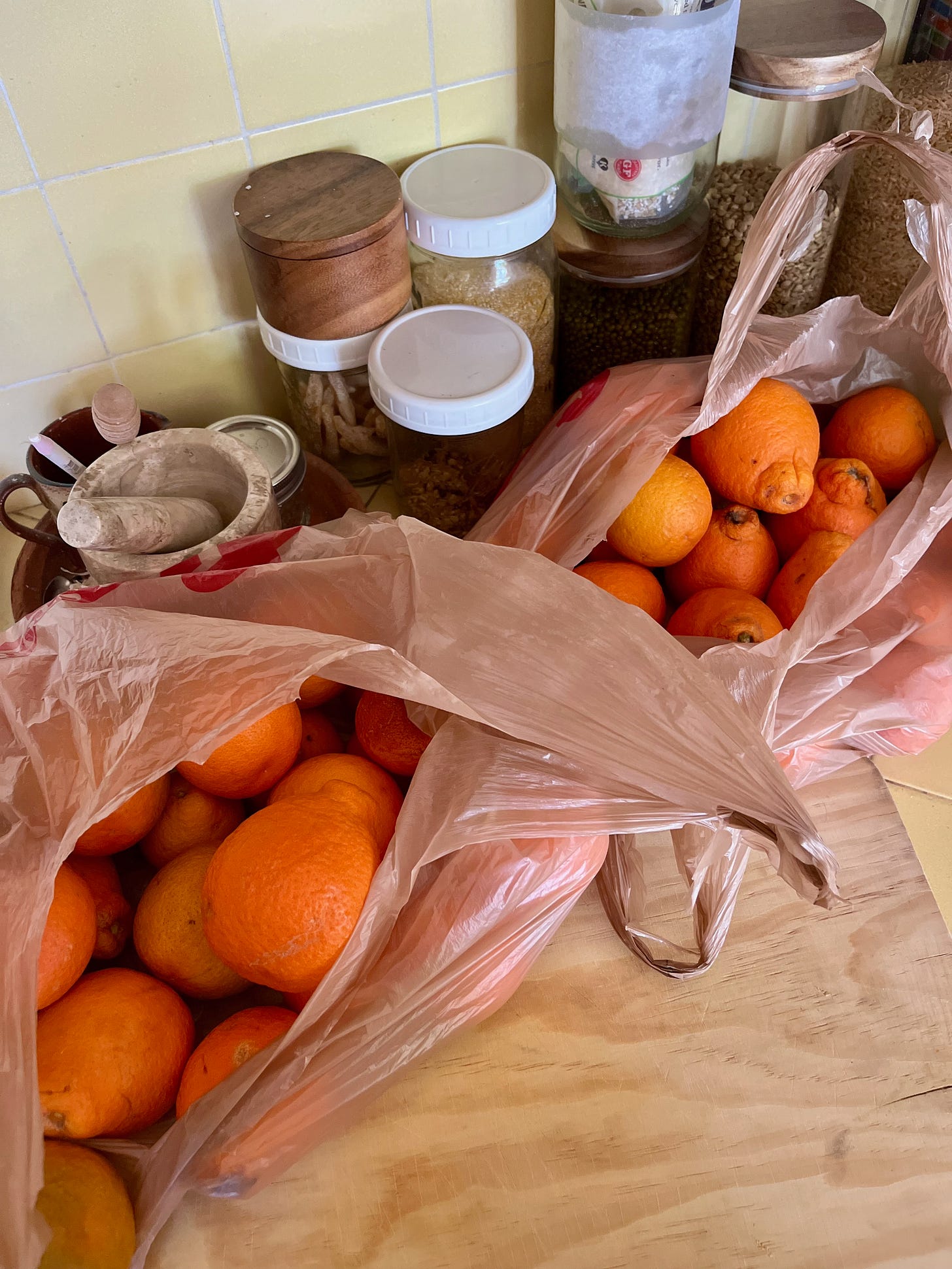 Fill wide mouthed jars with the sliced lemons and oranges mixed with almost equal parts sugar. Wipe up the orange juice from the counter and the floor.